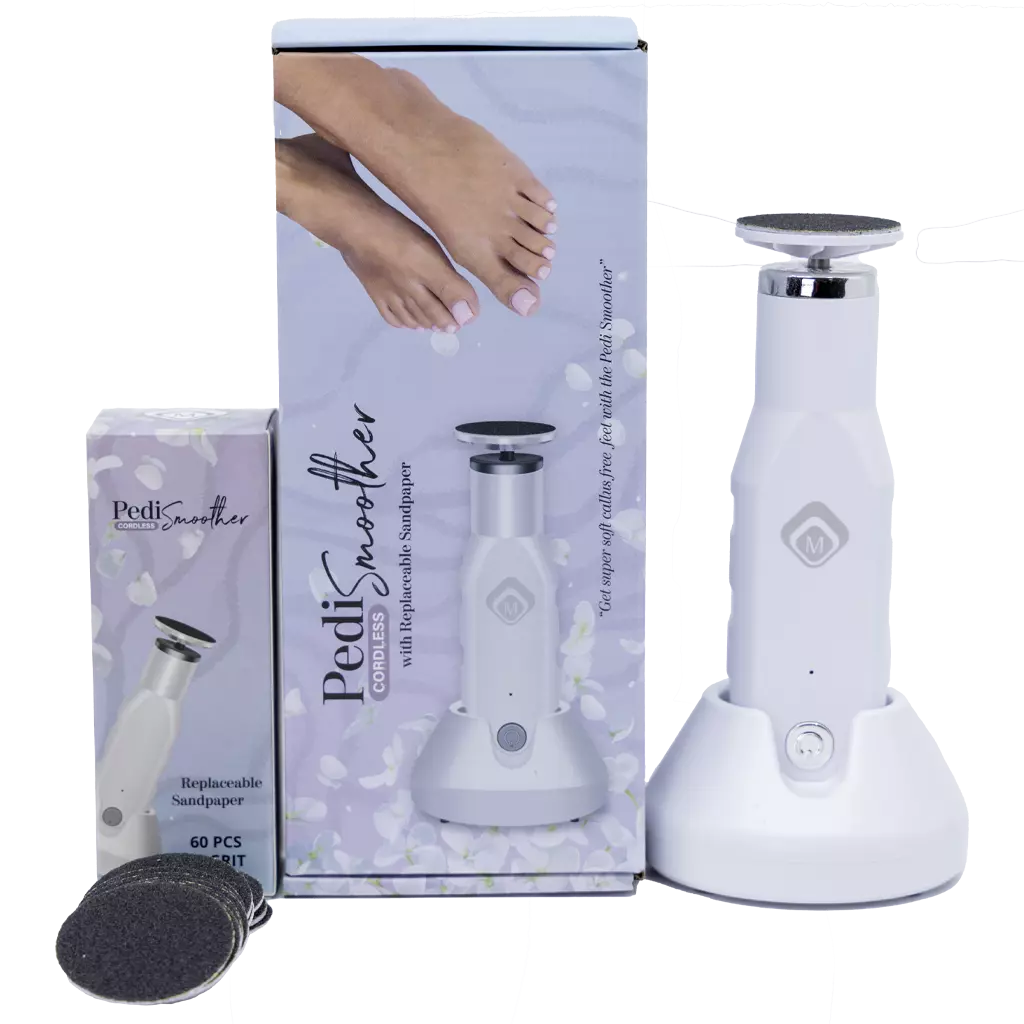 Verwijder eelt op voeten met deze draadloze Pedi Smoother met 80 grit schuurschijfjes . De vervangbare schuurschijfjes zijn ook los verkrijgbaar per 60 stuks (artikelnummer 190062).
